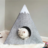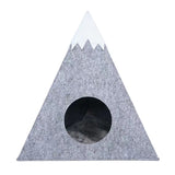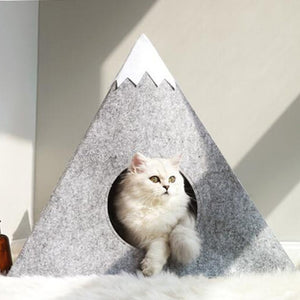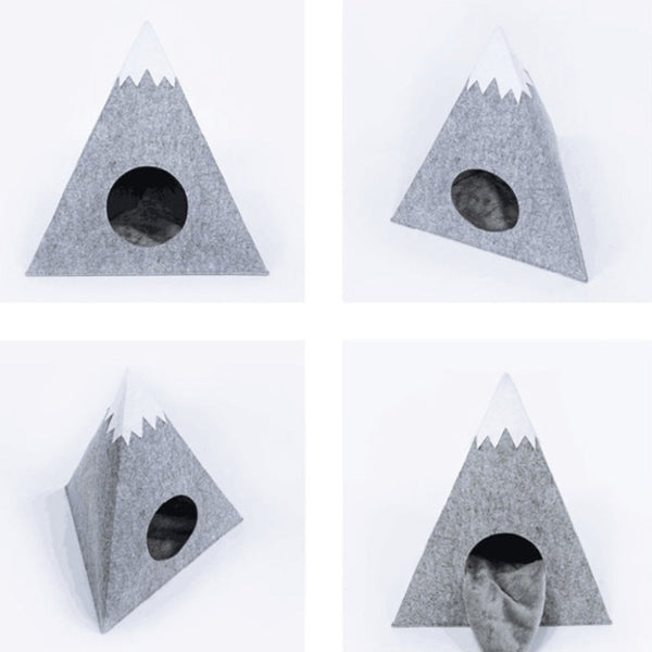 The felted fabric “tent” bed for cats is an original shelter that has the appearance of a snowy mountain. Made of felt, it also has a sherpa pillow inside.