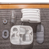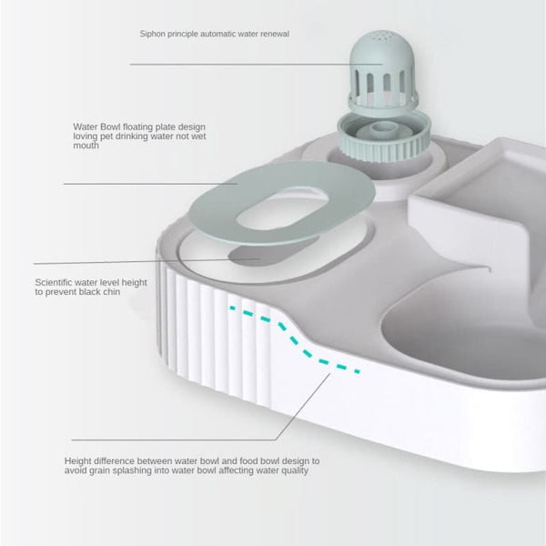 Le siphon en fond de fontaine restitue l'eau de l'abreuvoir à une vitesse optimale, tout en protégeant des fuites. Le distributeur est composé d'un système qui évite que les croquettes ne se coincent, grâce à une grande ouverture.