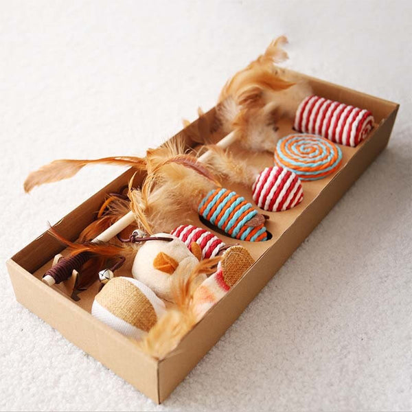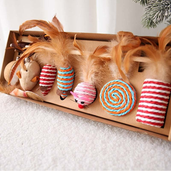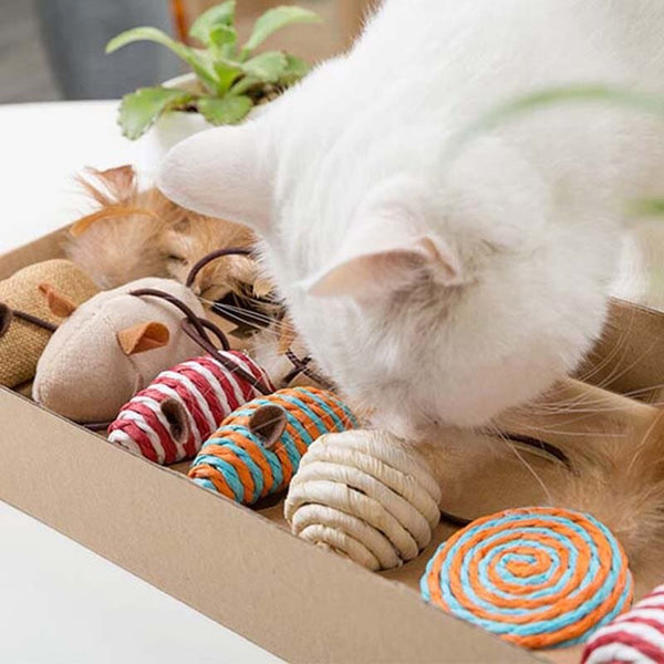 Faites plaisir à votre chat en lui offrant ce superbe Coffret cadeau de 7 jouets exclusifs en plume et sisal.
