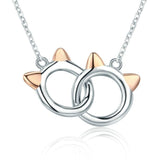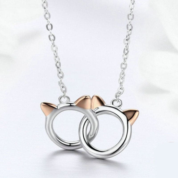 Collier argent 2 anneaux têtes de chats entrelacées avec petites oreilles dorées.